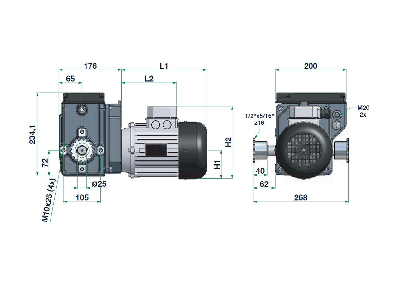 | 编号 | 型号 | m (kg) | L1 (mm) | >L2 (mm) | H1 (mm) | H2 (mm) | 扭矩 (Nm) | 转速 (R/min) | 功率 (kW) | 电压50HZ (V) |